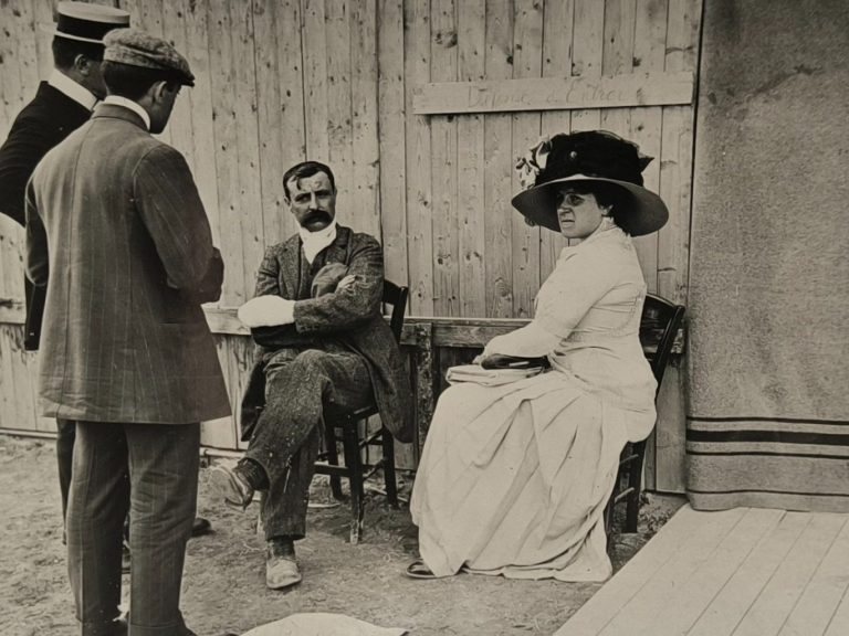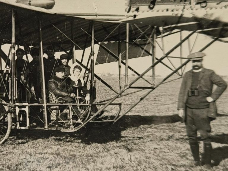 Devant l'avion du record Louis Blériot, assise à coté du pilote Léon Lemartin, Jeanne Herveu, amie très proche,